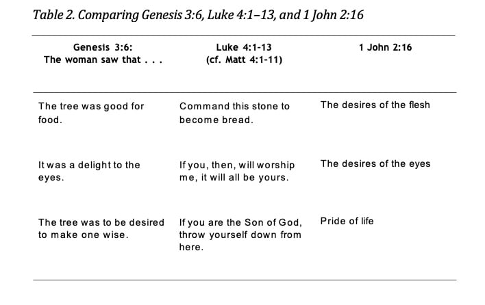 I am not certain that the three phrases in 1 John 2:16 line up exactly with Genesis 3:6 and Luke 4 or that John has these parallels in mind. But the three phrases in 1 John 2:16 seem to line up at least roughly with Genesis 3:6 and Luke 4, so the parallel seems legitimate.