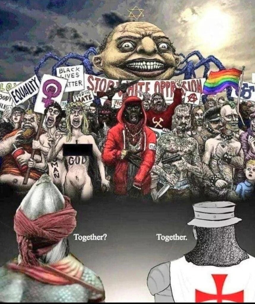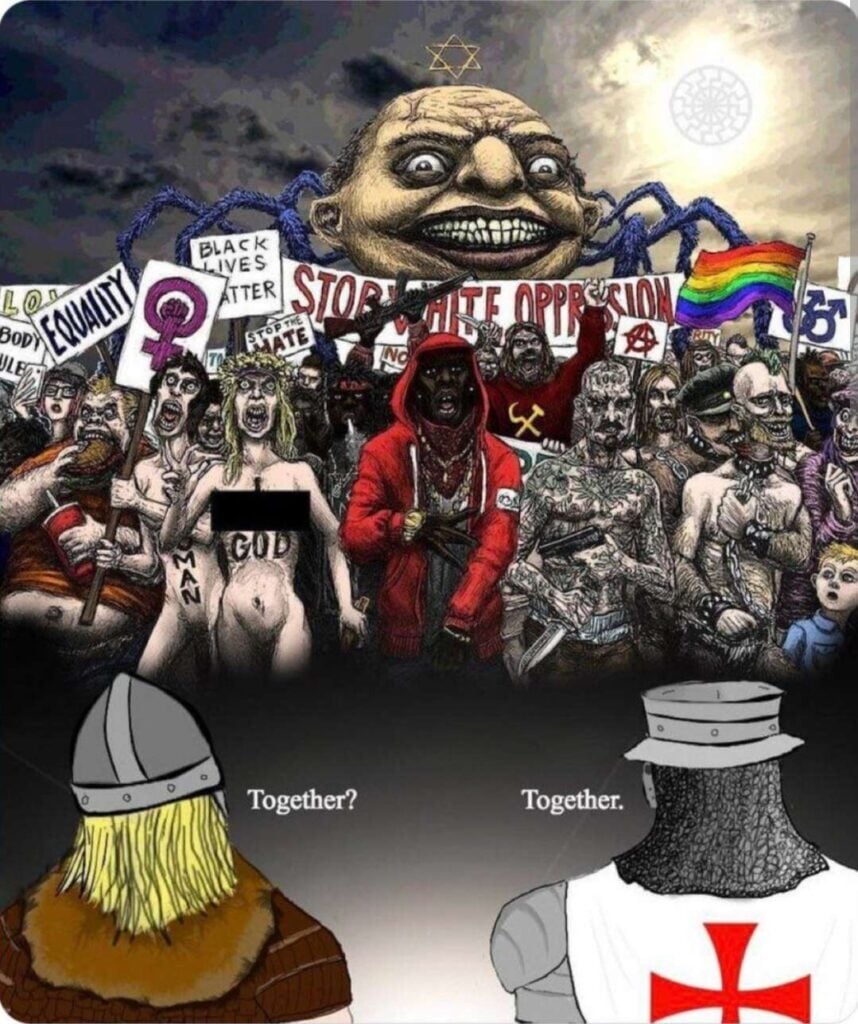 Extremist Christian-professing groups have adapted this cartoon to present themselves and potential “traditionalist” allies as sentinels against the darkness. In one version, a Christian Crusade knight is standing next to a Norse barbarian.