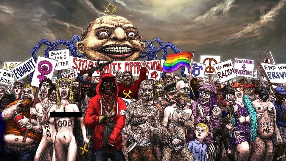 Note the rogue’s gallery of degenerate interest groups: screeching feminists, inner city and MS13 gang members, homosexuals, and pedophiles. Note the massive Jewish spider towering like a puppet-master behind them, complete with bulbous nose, lustful eyes, and Star of David crown. Whether the artist was aware or not, the drawing echoes Nazi-era German propaganda that used spider symbolism to portray Jews as the source of all evil.