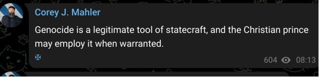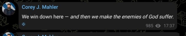This pastor—a shepherd of a small local church I wasn’t a member of—went to Corey Mahler’s public Telegram. There, Ellis took dozens of screenshots of posts that were available to all.