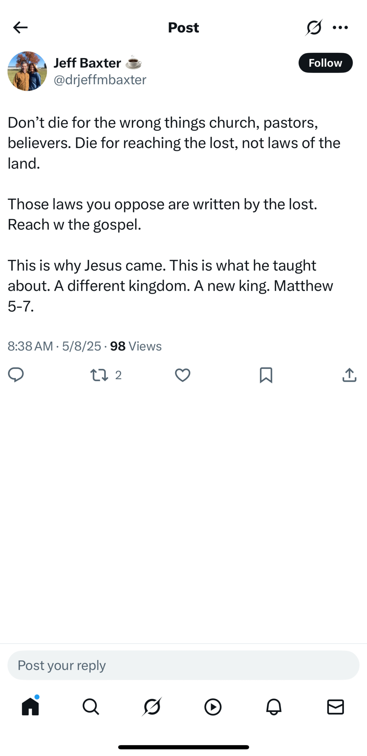 Just days before discouraging opposition to HB 25-1312, Baxter tweeted, “The purpose of the church is evangelism.” That belief helps explain his posture. If evangelism overrides every other aspect of ministry, anything that causes friction with the culture, including resisting dangerous legislation, gets treated as a threat to the mission. Those promoting the bill aren’t seen as advancing evil, but simply as “the lost” to be won over through winsome softness and accommodation.