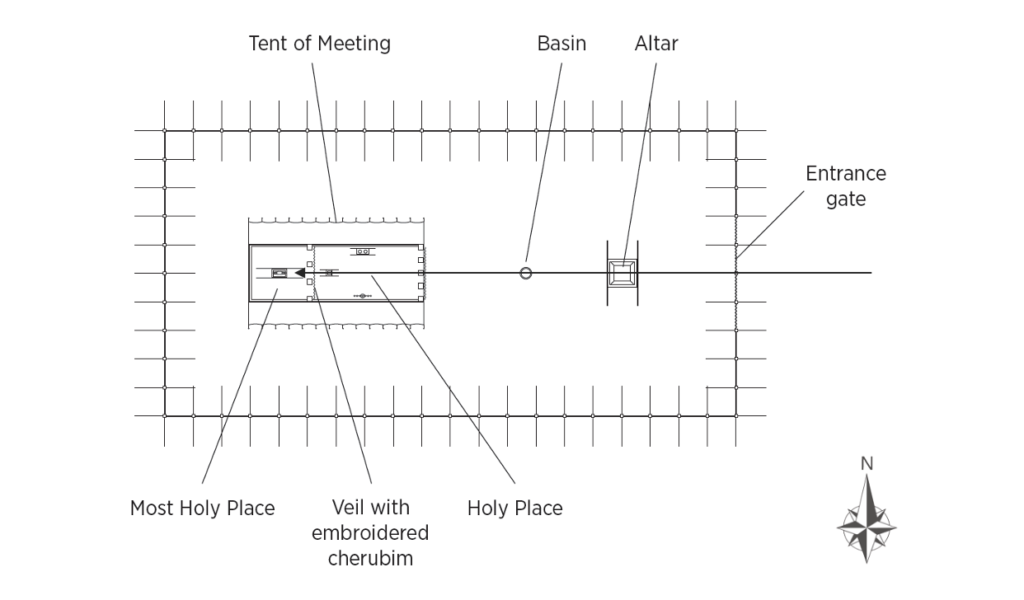 It is important also to note that the tabernacle complex is always set up with the entry gate facing east (Exod. 27:13–14; Num. 3:38). Thus, the only way the priests can enter is to pass through the gate heading westward. As priests continue westward, they must pass by the altar of sacrifice. Once per year, the high priest presses even farther westward into the Most Holy Place, which is “guarded” by the embroidered cherubim on the veil (Exod. 25:18–22; 26:31; cf. 1 Kings 6:23–29; 2 Chron. 3:14).
